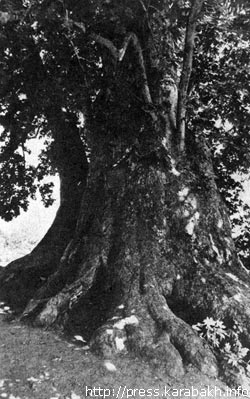 Это 2000-летнее дерево находится в Мартунинском районе НКАО (диаметр – 950 см, высота – 40 м). Сколько смерчей пронеслось над его кроной, сколько лезвий-молний вонзилось в его ствол! Но оно стоит по сей день и будет стоять в веках... Корни глубоко вплелись в мать-землю.