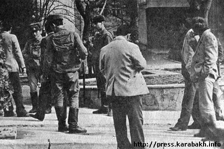 Да и что ему, бедняге, делать? С одной стороны, он каждый день наблюдает, как азербайджанские боевики, объявленные для проформы омоновцами, терзают чемоданы армян, отбирают вещи, вымогают взятки, обшаривают (тоже в «поисках оружия»?) женщин...